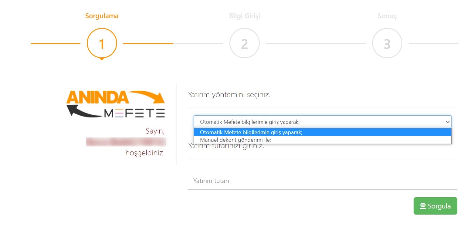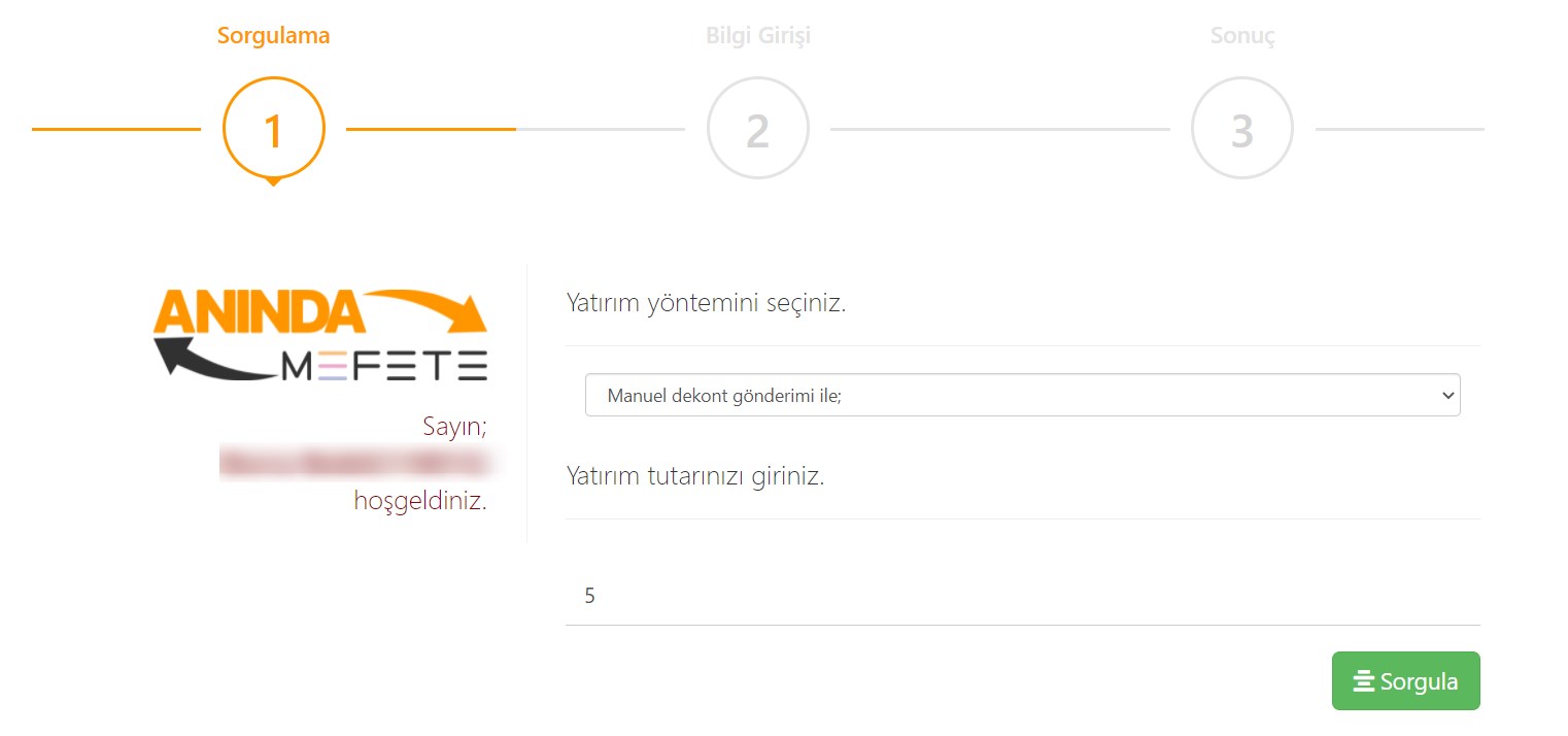 Funbahis Otomatik Mefete ile Para Yatırma, Bu kısımda Otomatik Mefete bilgilerimle giriş yaparak seçeneğini seçtikten sonra alt kısma yatırım tutarınızı giriniz. Bizler örnek amaçlı 5 TL olan yatırım tutarını girerek sizlere anlatacağız. Yatırım tutarı kısmına 5 TL yazdıktan sonra Sorgula butonuna tıklayınız. Ardından 2. aşama olan Bilgi Girişi ekranına geçiş yapacaksınız. Alt kısımda resim olarak ilettik.