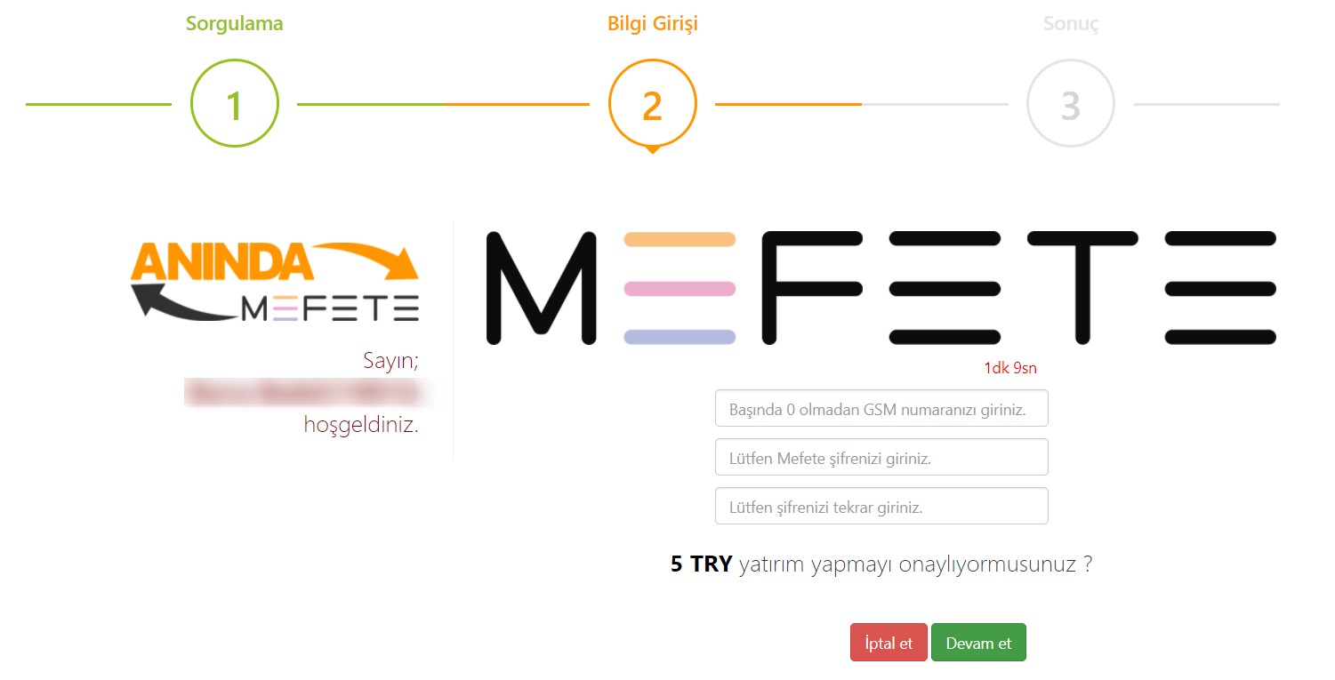 Yukarıda ki boşlukları doldurmanız gerekmektedir. Boşlukların içinde de yazdığı gibi ilk kutucuğa başında 0 (sıfır) olmadan Mefete de kayıtlı telefon numaranızı yazmalısınız. Ardından 2. ve 3. kutucuğa Mefete’ye giriş şifrenizi girmelisiniz. İki şifreyi de aynı girdiğinizden emin olunuz. Bütün bilgi kısımlarını doldurduktan sonra alt kısımda bulunan yeşil kutucuğa Devam et butonuna basmalısınız. Sizden istenen bilgileri doğru şekilde girmiş olmalısınız. Ayrıca bakiyenizde yatırım yapmayı düşündüğünüz tutar bulunmalıdır. Bu durumları eksiksiz yerine getirmenizin ardından tutar kısa süre içerisinde bakiyenize aktarılacaktır. Sonrasında dilediğiniz casino da oyun oynayabilir ve kazanç sağlayabilirsiniz.