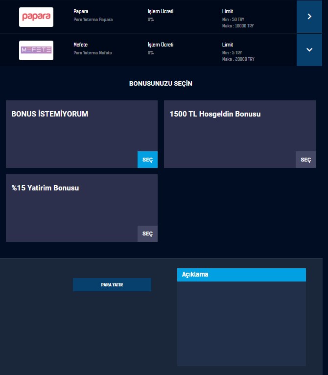 Bu kısımda karşınıza alabileceğiniz bonus seçenekleri çıkacaktır. Funbahis sizleri uğraştırmamak için sizlere bonus seçeneklerini yatırım esnasında seçerek alma imkanı sunmaktadır. Çoğu sitede bonus için yatırım sonrası bakiyeye dokunmadan canlı desteğe bağlanmalısınız. Bu durum sizlere zaman kaybettirmektedir. Funbahis’te seçmeniz durumunda yatırımınız bonusunuz ile beraber hesabınıza otomatik aktarılmaktadır. Bu kısımda size uygun bonusu seçtikten sonra Para Yatır butonuna tıklamalısınız. Ardından yeni bir sayfa açılacak ve yatırım yapmak istediğiniz yöntemi seçmelisiniz. İki seçenek mevcuttur. Otomatik Mefete bilgilerimle giriş yaparak ve Manuel Dekont gönderimi ile, ilk olarak Otomatik Mefete bilgilerimle giriş yaparak seçeneğini açalım.