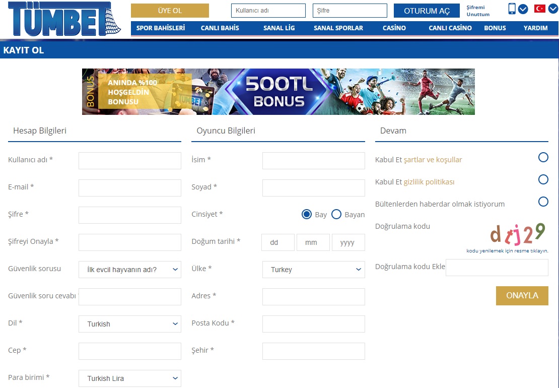 Üyelik formunda * işareti bulunan Kullanıcı Adı, E-mail, Şifre, Güvenlik Sorunu(Şifrenizi unutursanız), DiL, Para Birimi, Telefon, Ad, Soyad ve Adres bilgilerinizi yazarak anında ücretsiz üyelik oluşturabilirsiniz. İnternet üzerinden bahis yapıp casino oyunları oynayabileceğiniz Tumbet bahis sitesine üye olabilmek için yaşınızın en az +18 ve üzeri olması gerekmektedir. Tumbet online bahis sitesine üye olduktan sonra yapacağınız ilk para yatırma işlemine 500 TL’ye kadar %100 Hoşgeldin Bonusu alabilirsiniz. Spor bahisleri ve casino oyunlarında geçerli olan düşük çevrim şartlı hoşgeldin bonusu ile daha kısa sürede daha büyük kazançlar elde edebilirsiniz.